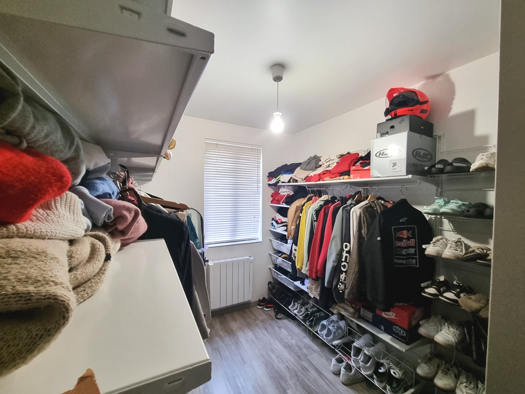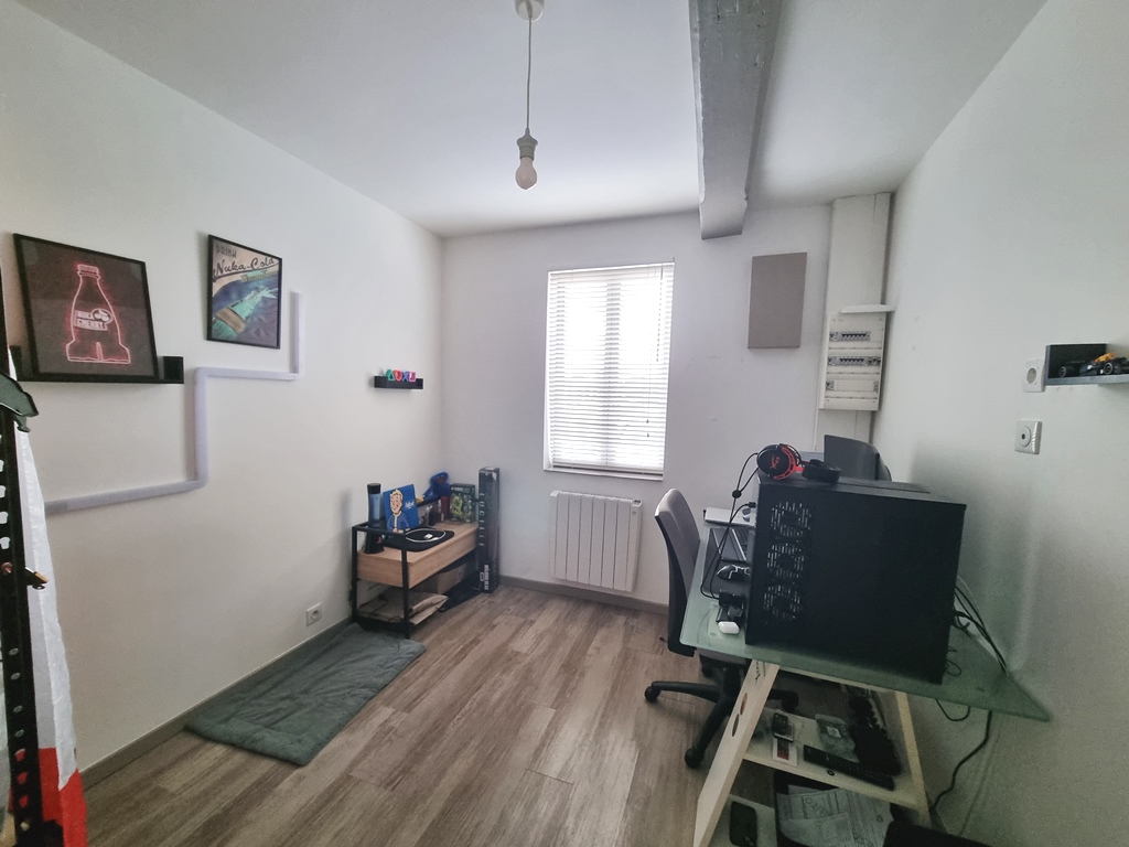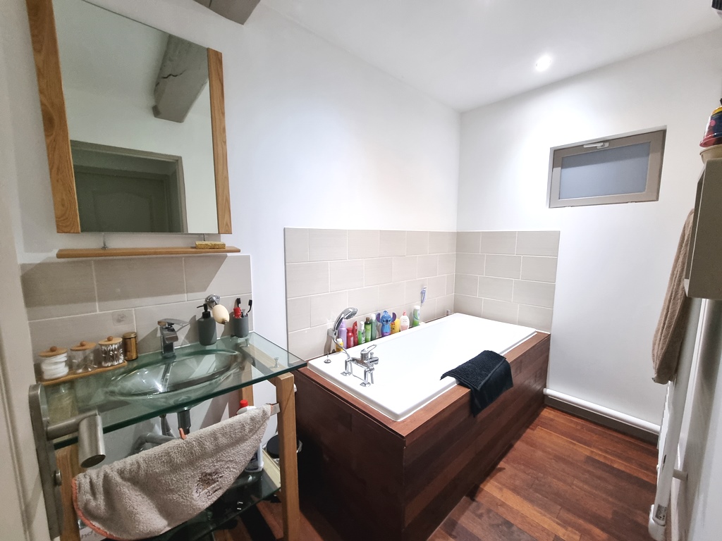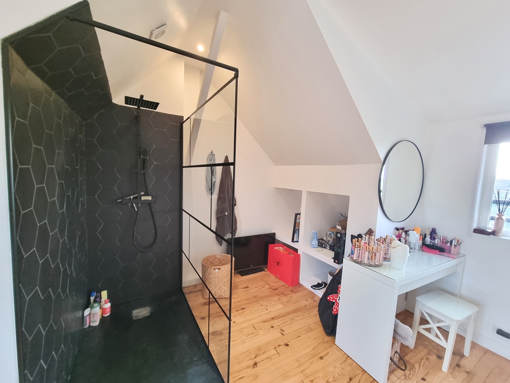 A l’étage, nous avons une très belle chambre parentale avec poutre apparente et salle de douche.